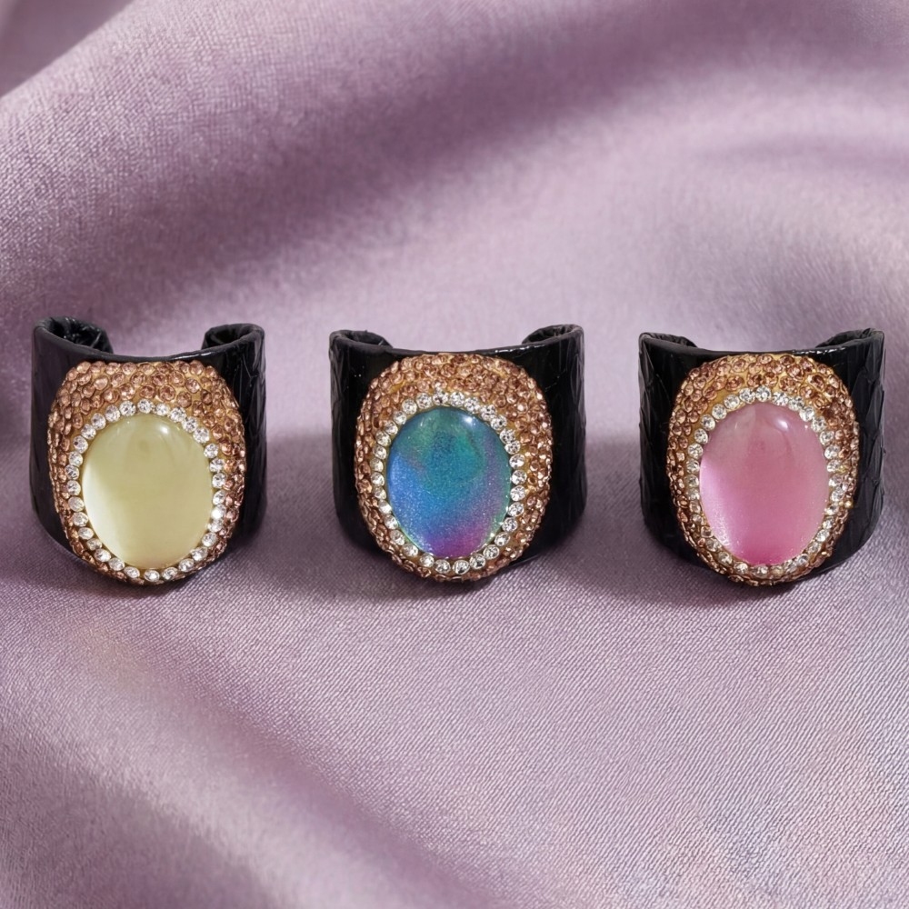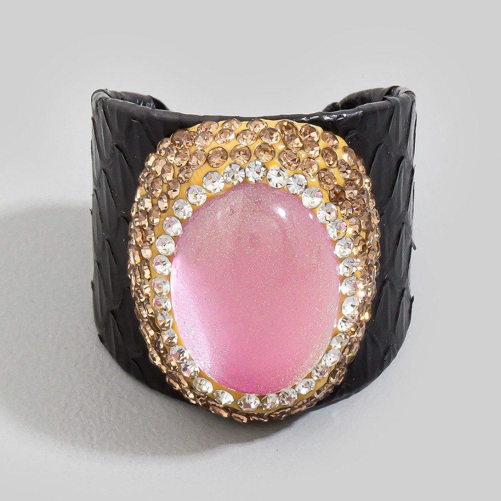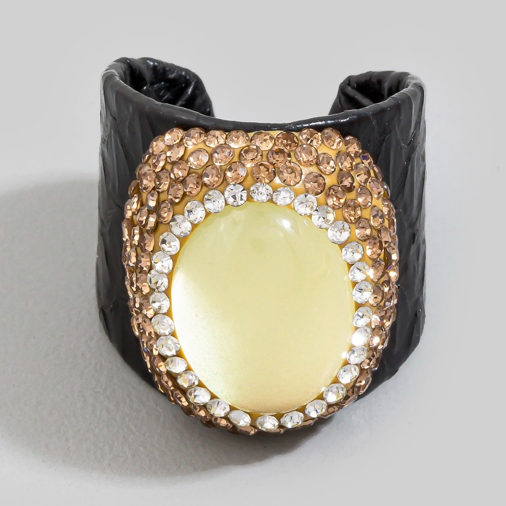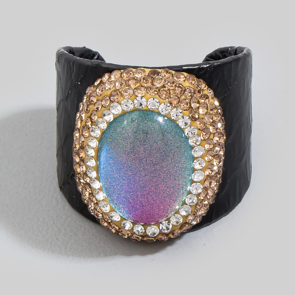 - A true work of art, this ring brings a one-of-a-kind oval glass stone pave leather band statement design. Elevate your style effortlessly with this versatile ring, enhancing the appeal of any ensemble. Available in BL, PK, YW. This item is sold in packs of 1.