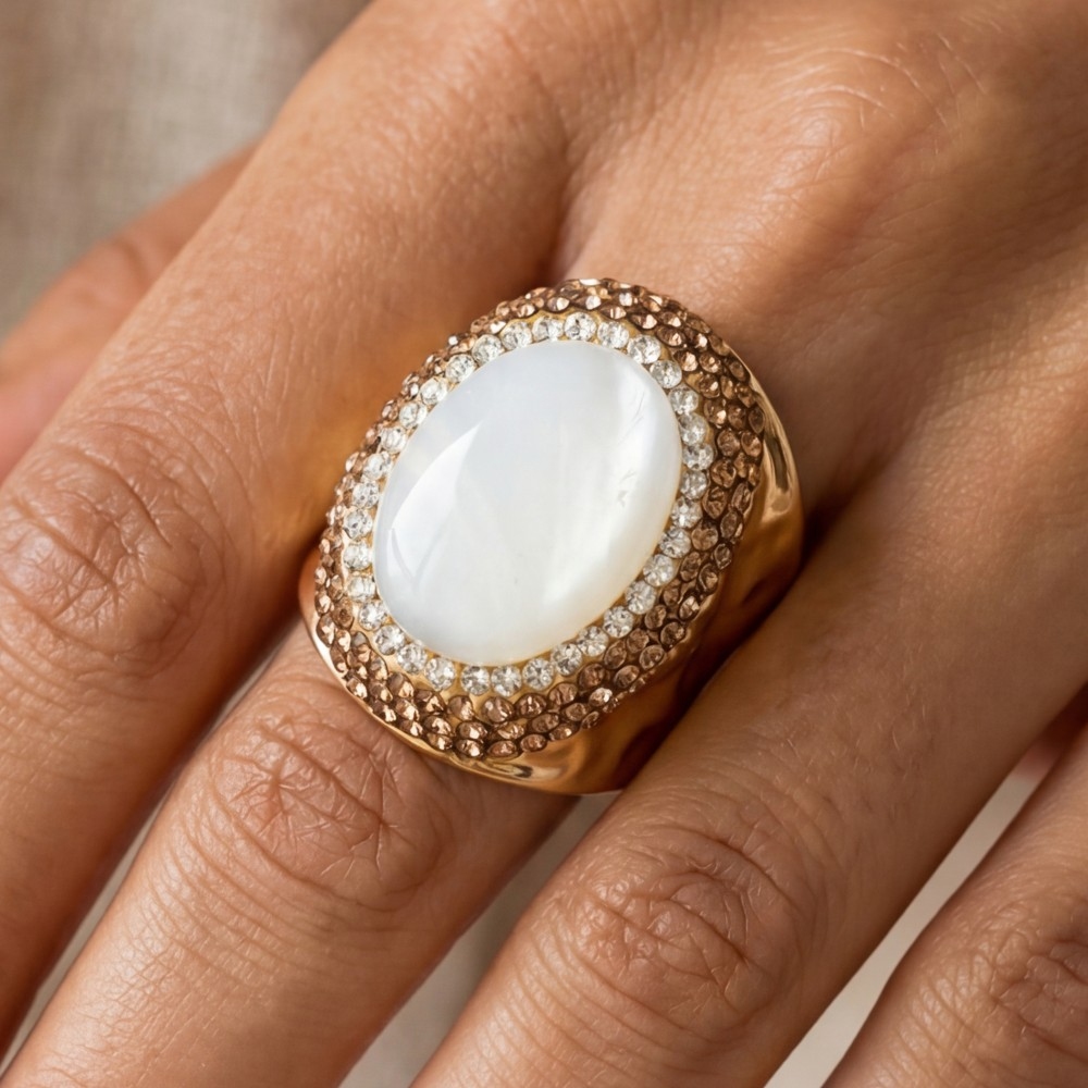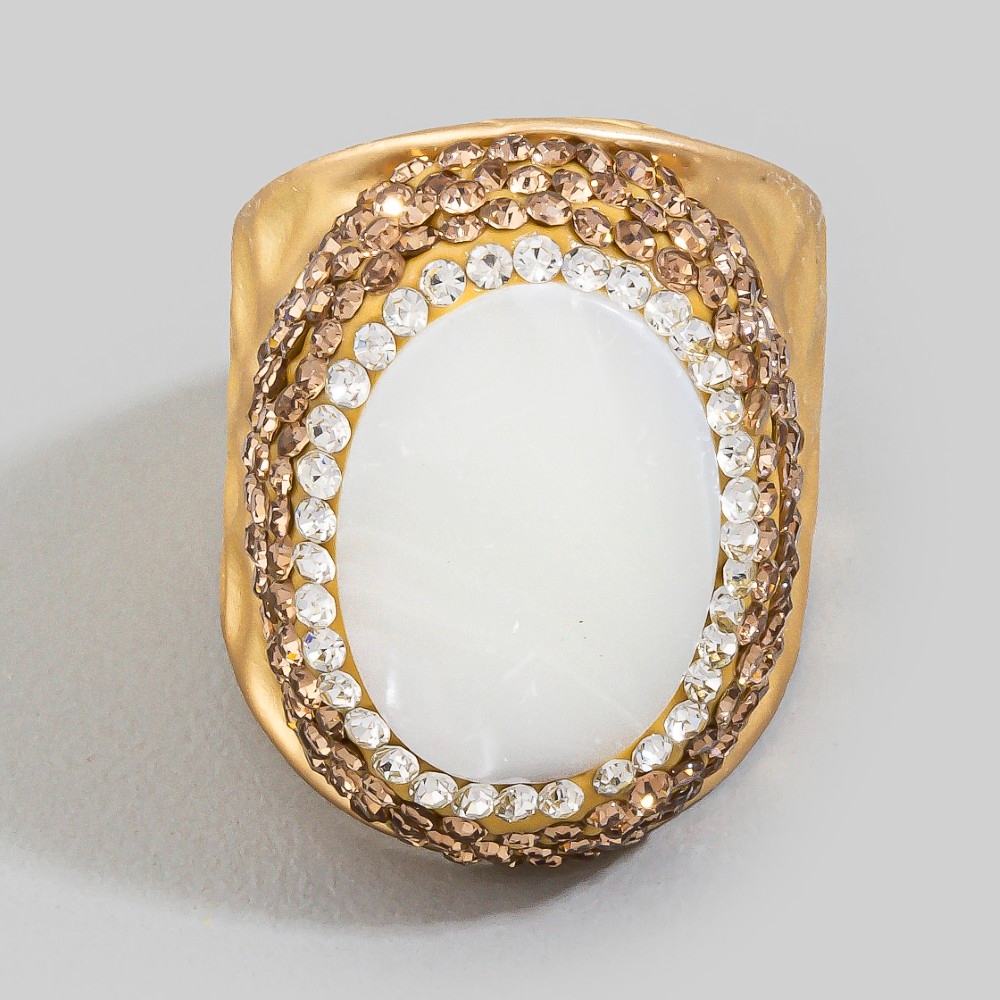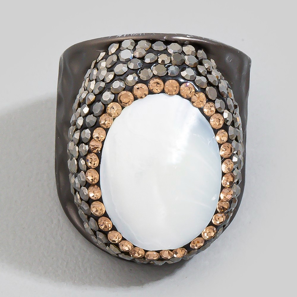 Add a touch of elegance and glamour to your look, this ring offers a remarkable oval pearl stone pave statement design. Transform your outfit from ordinary to extraordinary with the touch of elegance provided by this versatile ring. Available in BK, GD. This item is sold in packs of 1.