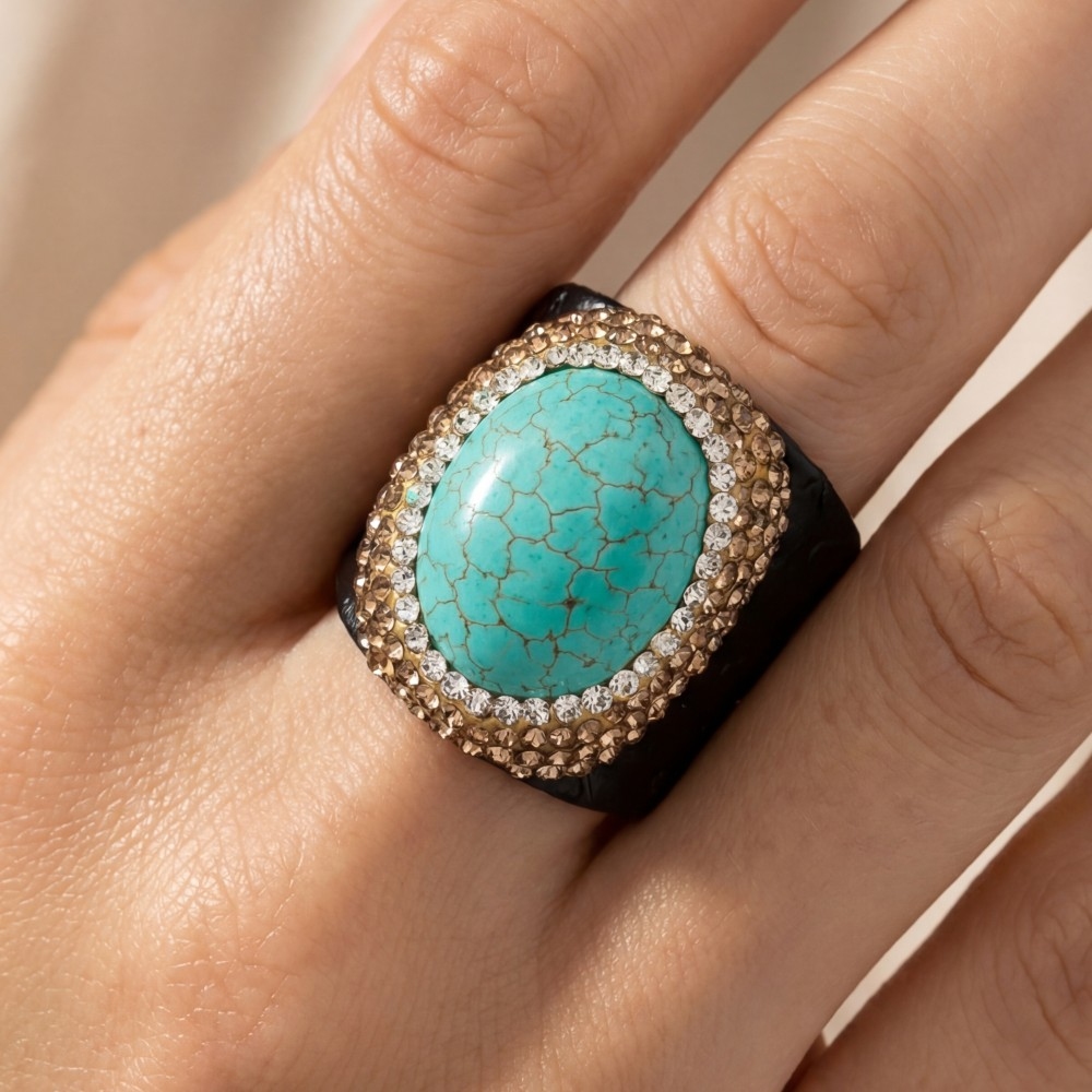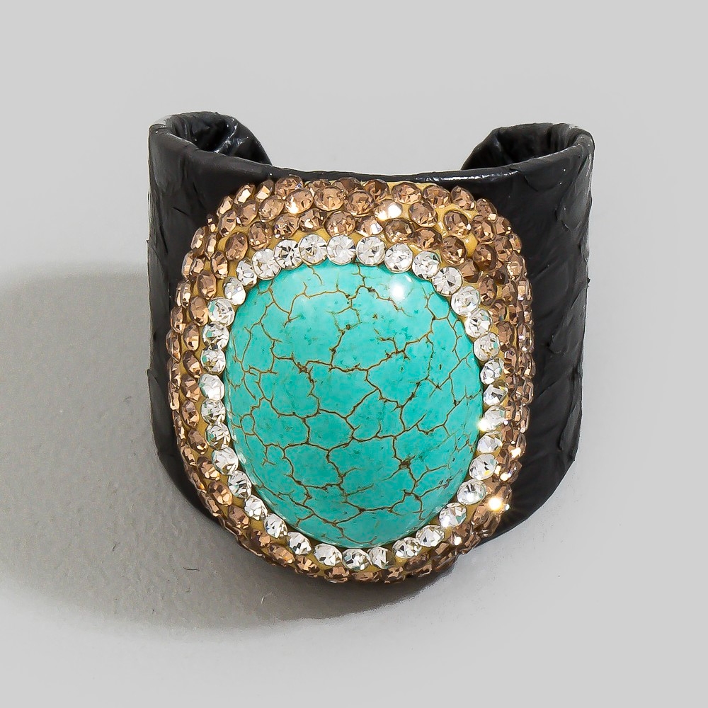 Make a statement, this ring encompasses a grand oval turquoise stone leather band statement design. Elevate your fashion ensemble effortlessly with this versatile ring, a stylish choice for the modern trendsetter. This item is sold in packs of 1.