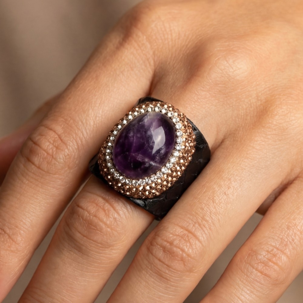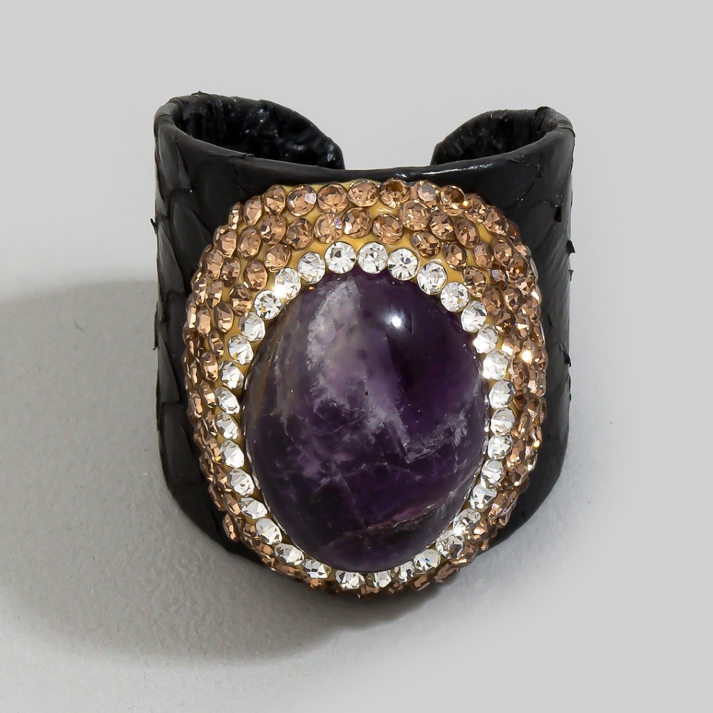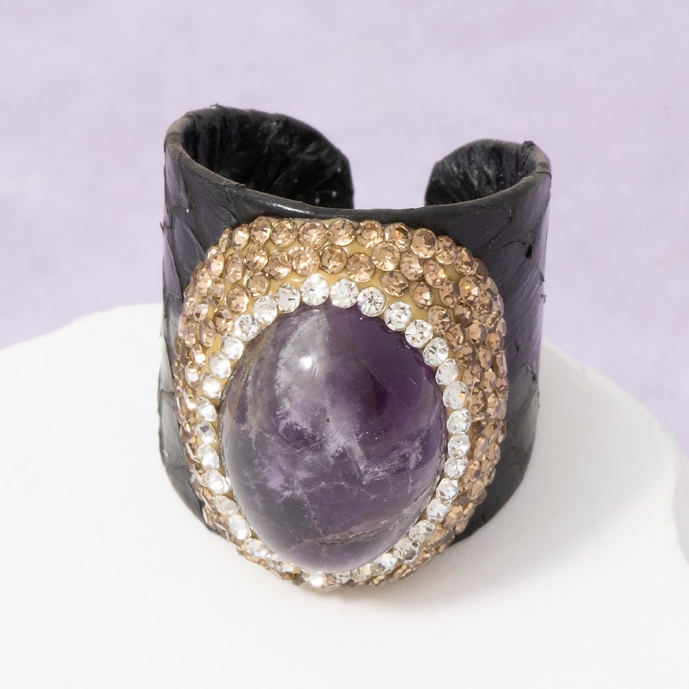 A timeless piece that you'll wear for years to come, this ring introduces an exceptional pave amethyst stone with leather band statement design. A versatile ring that's perfect for any occasion, adding a touch of elegance and style to any outfit. This item is sold in packs of 1.