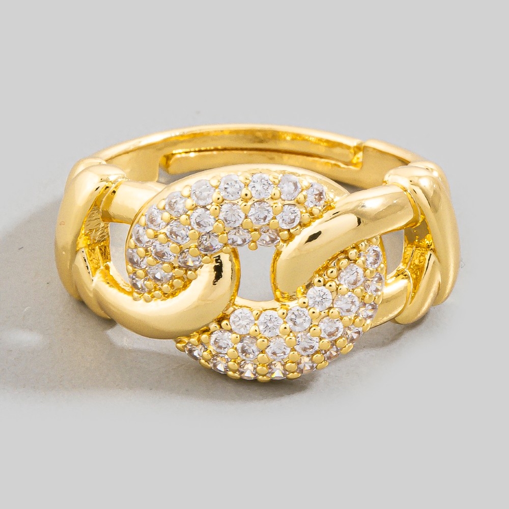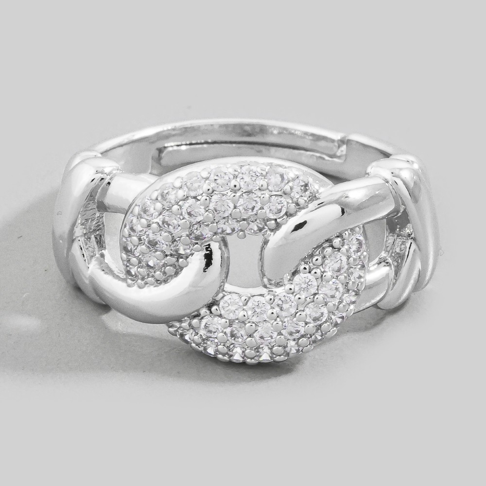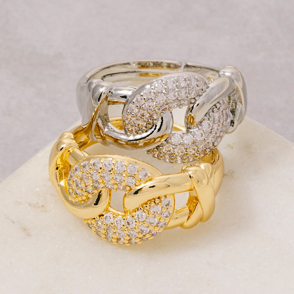 • A timeless piece that will never go out of style, this ring emanates an elegant pave chain link adjustable design. Add a dash of sophistication to your look with this versatile ring, a must-have for fashion enthusiasts. Available in G, S. This item is sold in packs of 12.