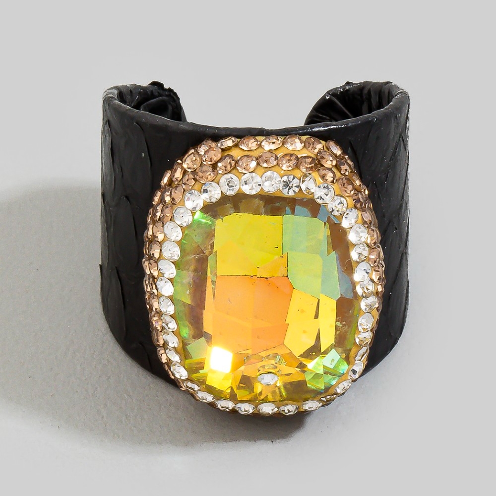 A bold and daring choice that is sure to impress, this ring possesses a fine pave crystal stone leather band statement design. This item adds the perfect finishing touch to any outfit, making it stand out from the crowd. This item is sold in packs of 1.