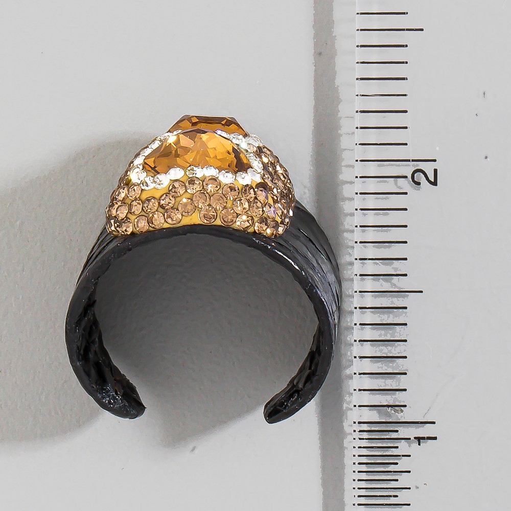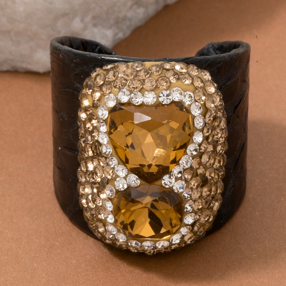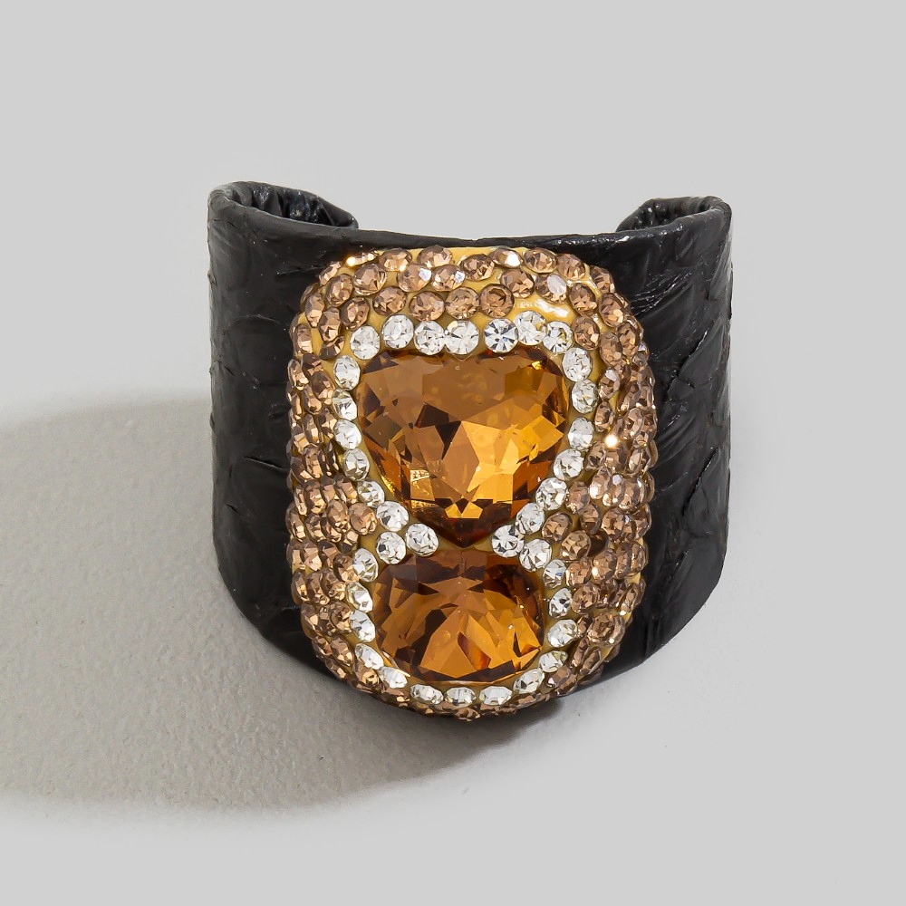 - Sleek and modern, this ring highlights a special pave glass crystal with leather band statement design. Perfect for adding a touch of glamour and sophistication to any outfit, this ring is a must-have. This item is sold in packs of 1.