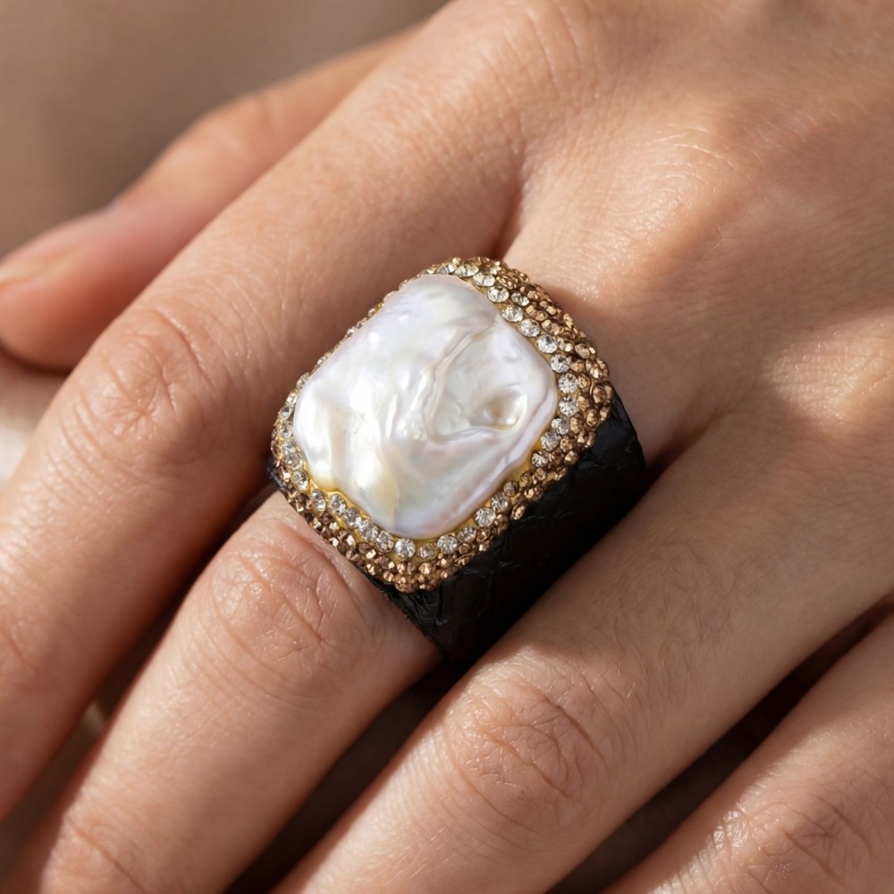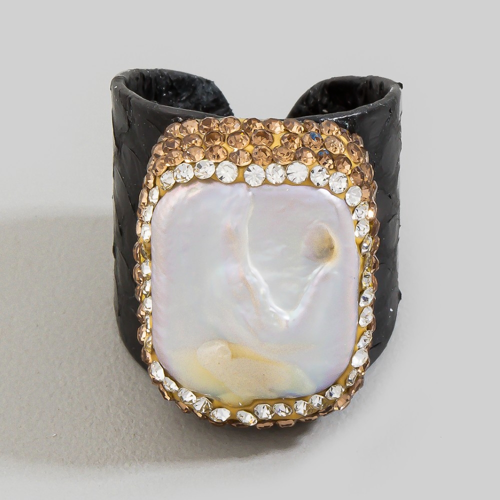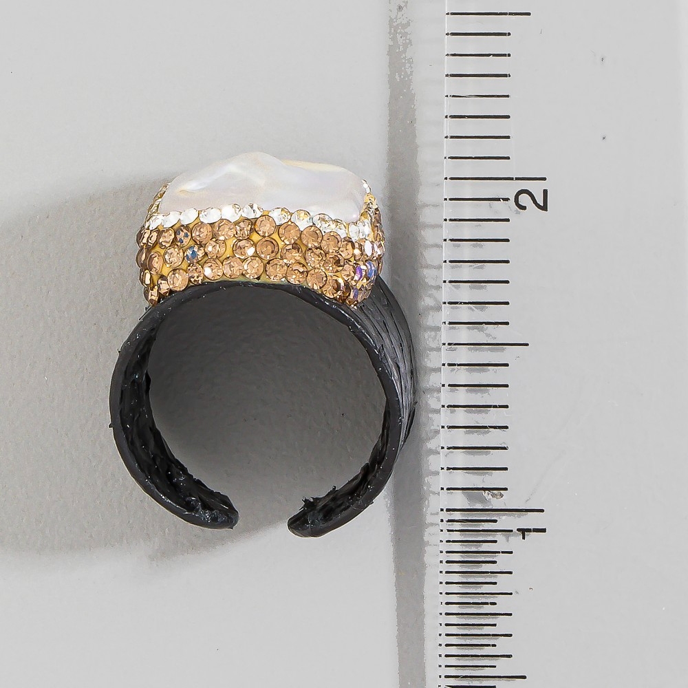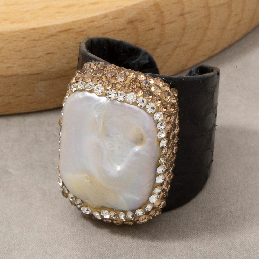 • A unique and stylish piece that sets you apart, this ring adds a distinctive pave pearl stone with leather band statement design. Perfect for adding a pop of color or texture to any outfit, this ring is a must-have. This item is sold in packs of 1.