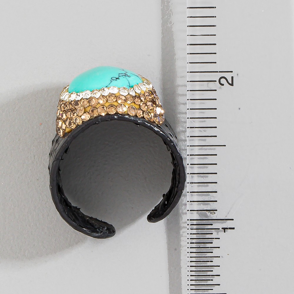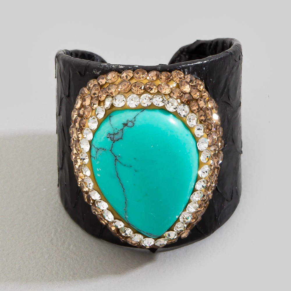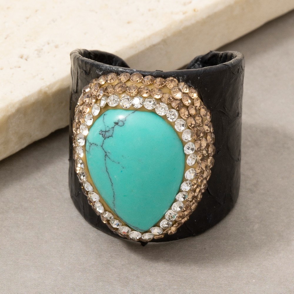 • A timeless piece that will never go out of style, this ring presents a striking pave turquoise stone leather band statement design. Perfect for adding a touch of glamour and sophistication to any outfit, this ring is a must-have. This item is sold in packs of 1.
