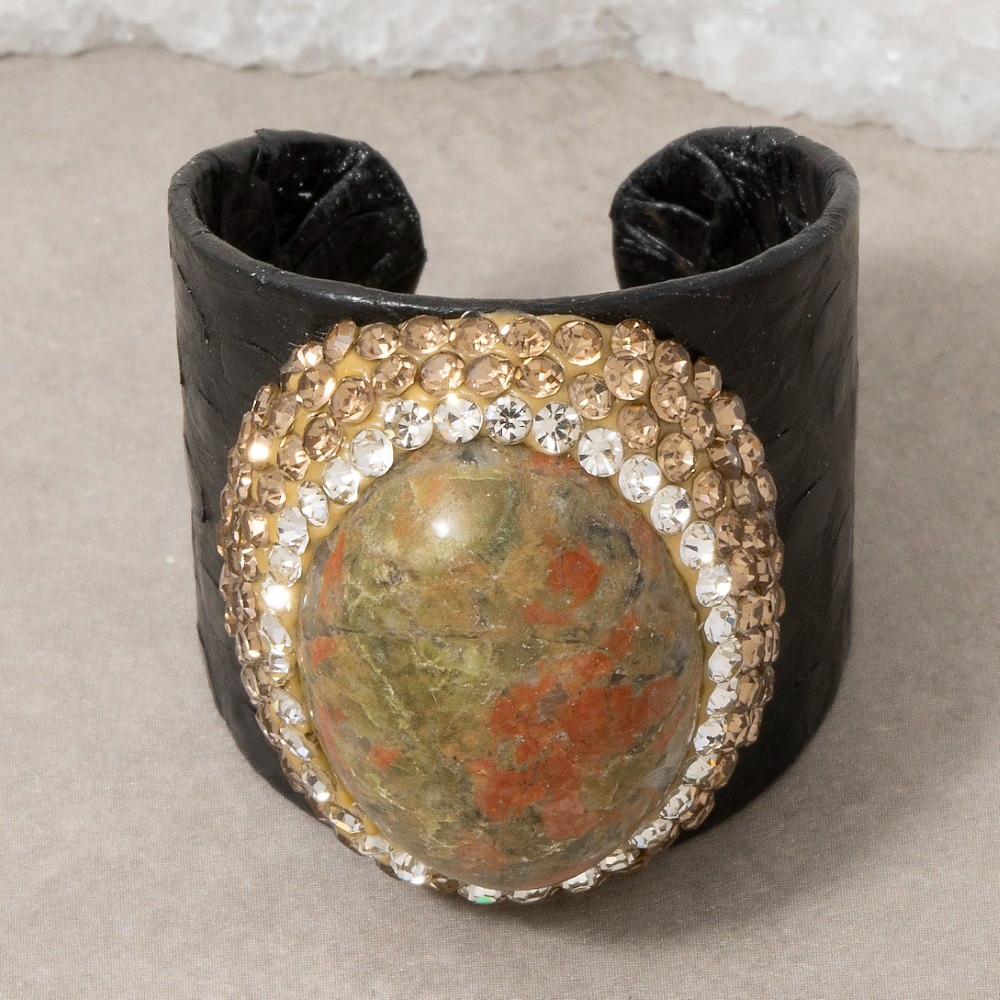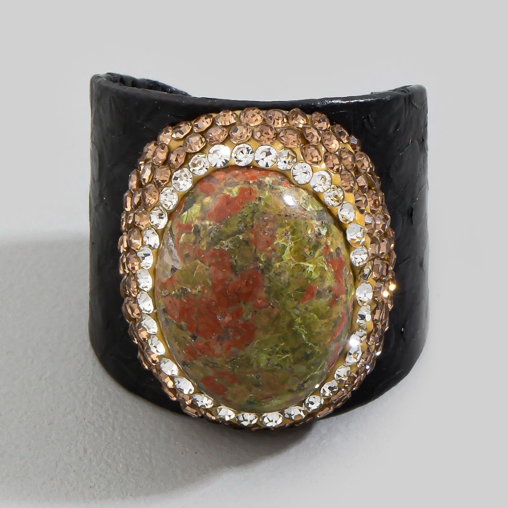 An instant wardrobe staple, this ring features a distinct pave unakite stones with leather band statement design. Unleash the potential of your wardrobe with this versatile ring, ensuring a touch of elegance in every ensemble. This item is sold in packs of 1.