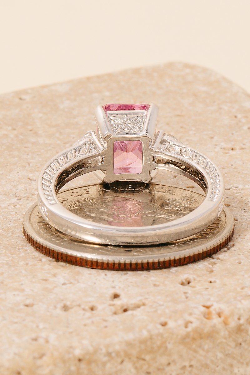 Make a statement, this ring showcases an alluring pink cubic zirconia baugette set pave band design. Master the art of accessorizing with this versatile ring, a key element for achieving a chic and polished look. Available in PK7. This item is sold in packs of 1.
