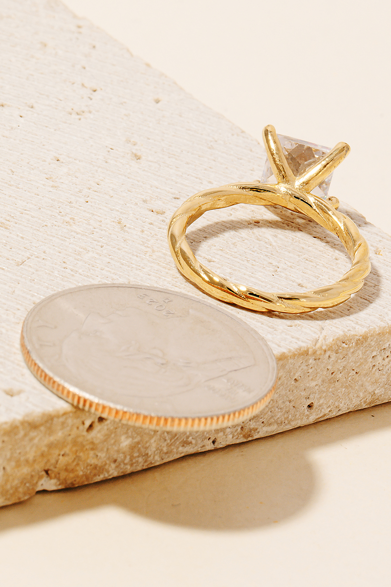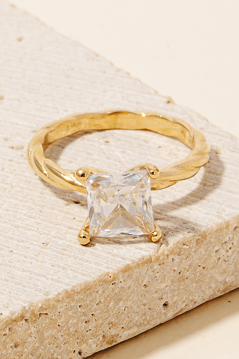 • Effortlessly stylish and always on-trend, this ring highlights a special princess cut rhinestone twisted metallic band design. Add a touch of glamour to your wardrobe with this versatile ring, perfect for enhancing the elegance of any look. Available in G and S. This item is sold in packs of 1. Ring size 6.75