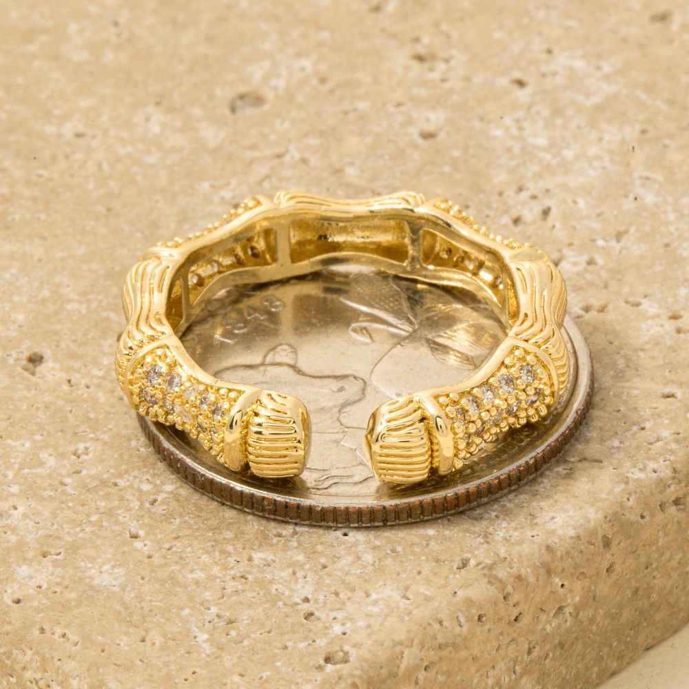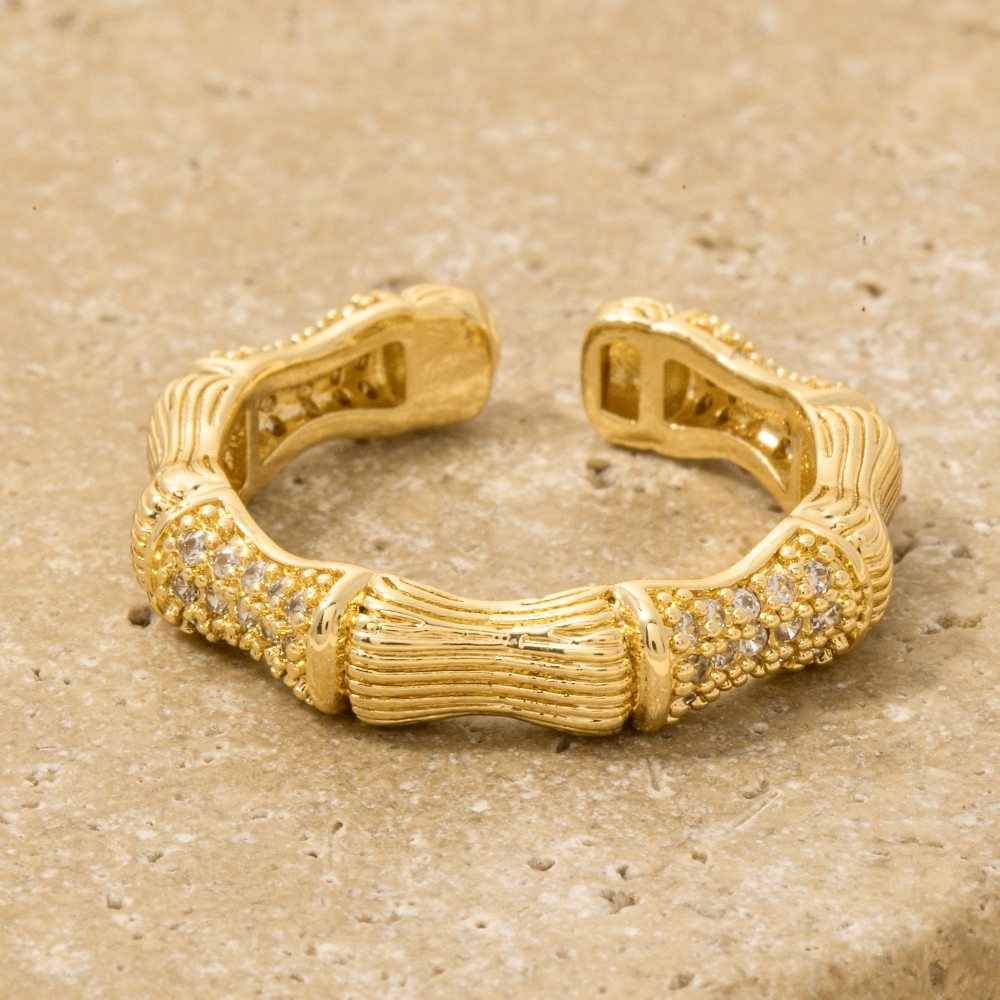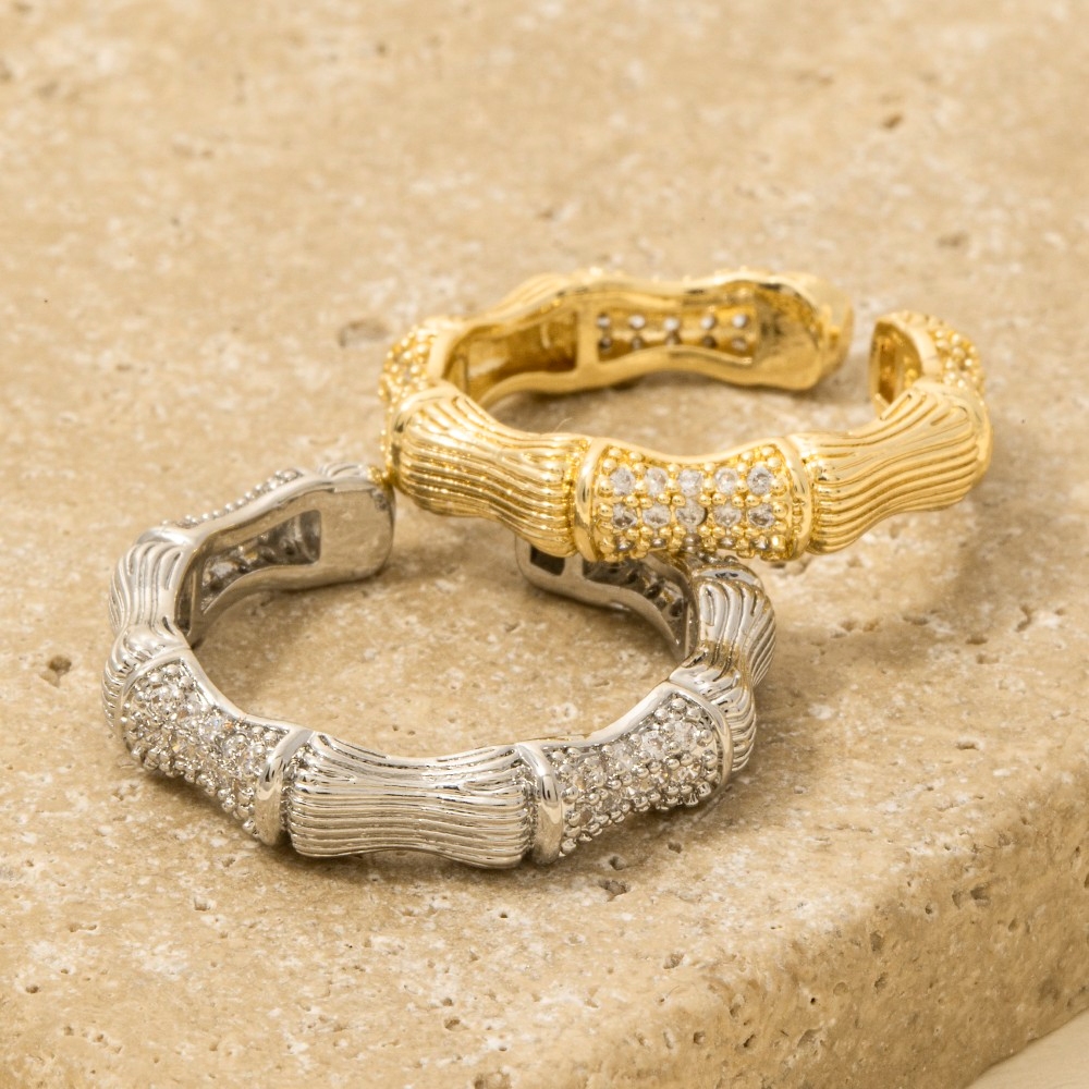- Uniquely designed and endlessly stylish, this ring incorporates a flawless ribbed rhinestone metal bamboo design. Upgrade your fashion game with this versatile ring, a timeless addition that complements any outfit seamlessly. Available in G, S. This item is sold in packs of 1.