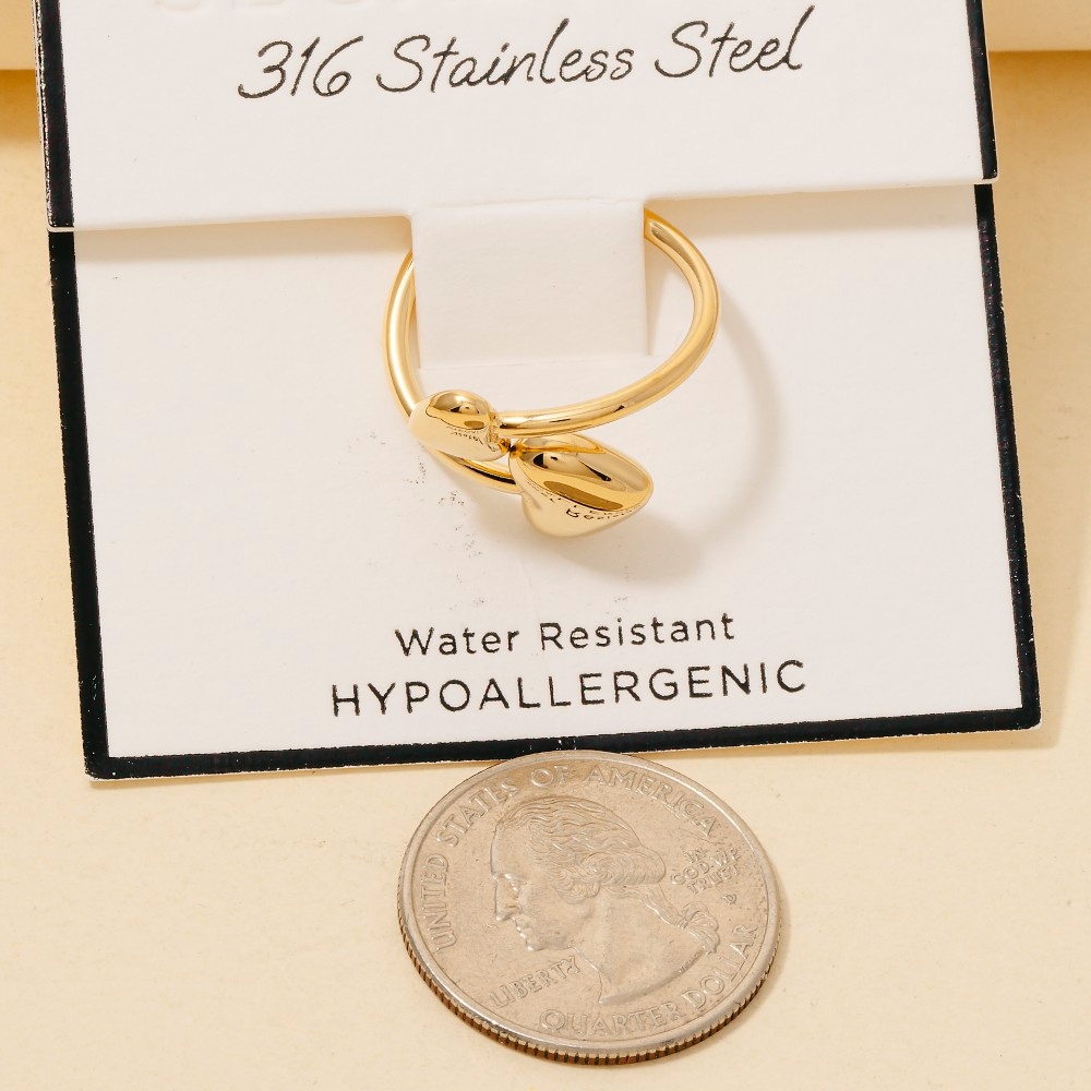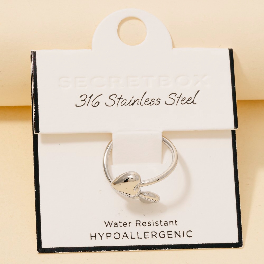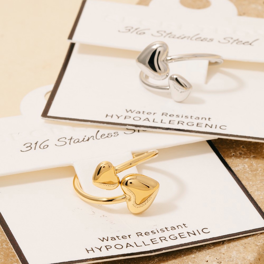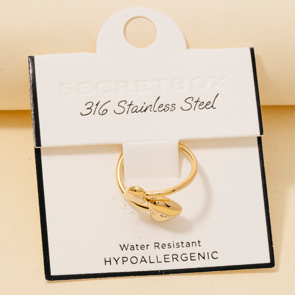 The perfect way to showcase your unique style, this ring features a distinct secret box stainless steel double heart end open band design. Elevate your fashion ensemble effortlessly with this versatile ring, a stylish choice for the modern trendsetter. Available in GD, RH. This item is sold in packs of 1.