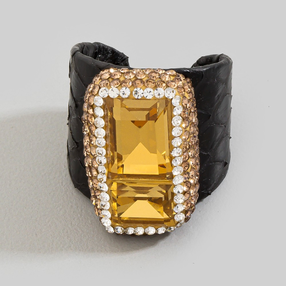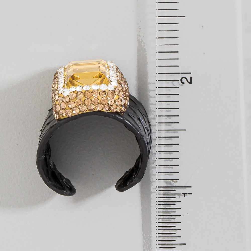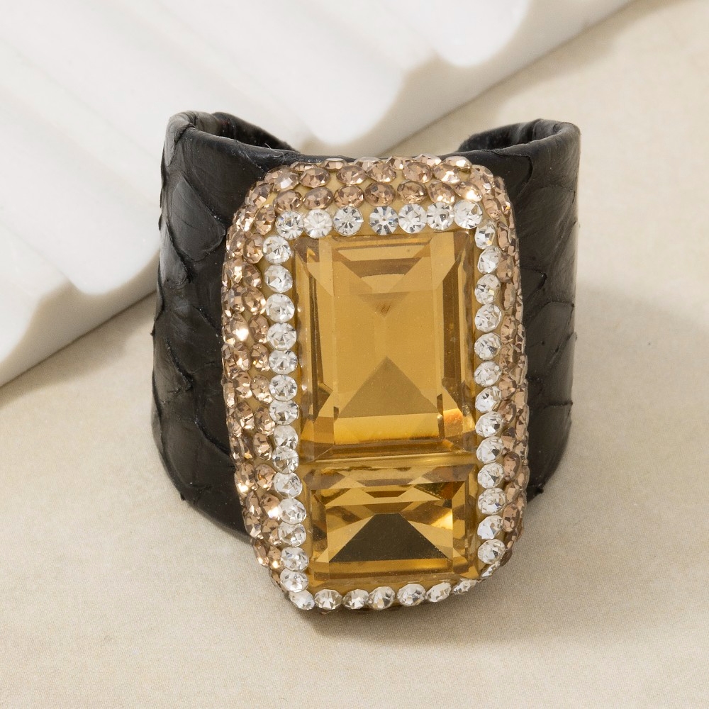 A stunning addition to any jewelry collection, this ring adds a distinctive two crystal stone with leather band pave statement design. Perfect for adding a pop of color or texture to any outfit, this ring is a must-have. This item is sold in packs of 1.