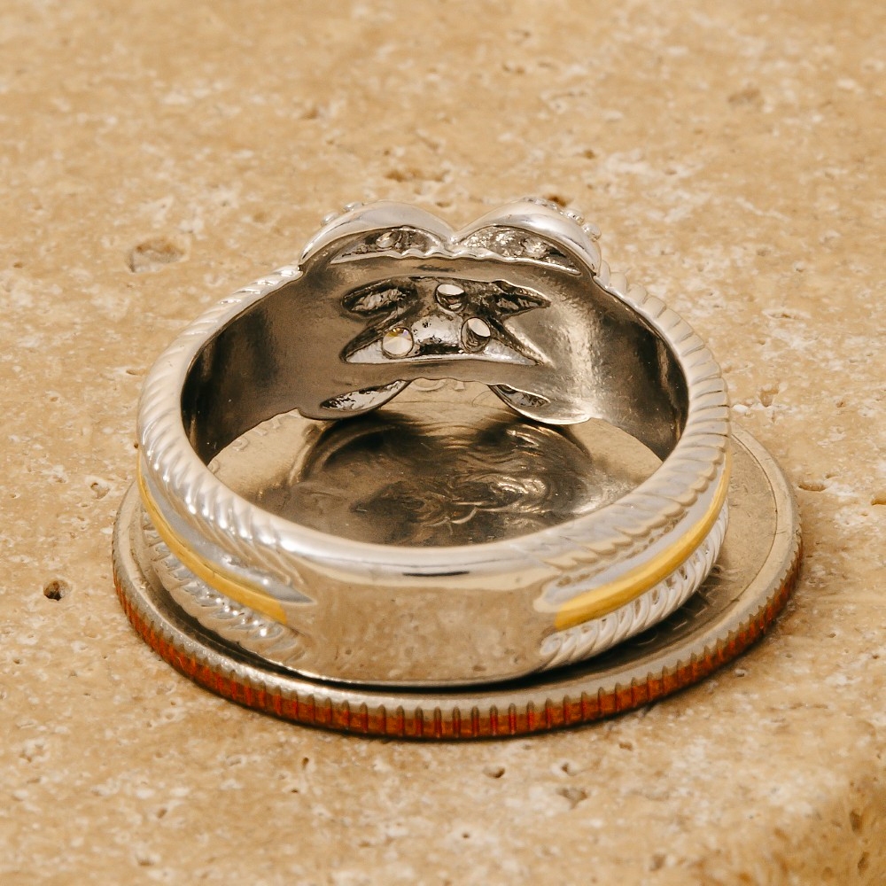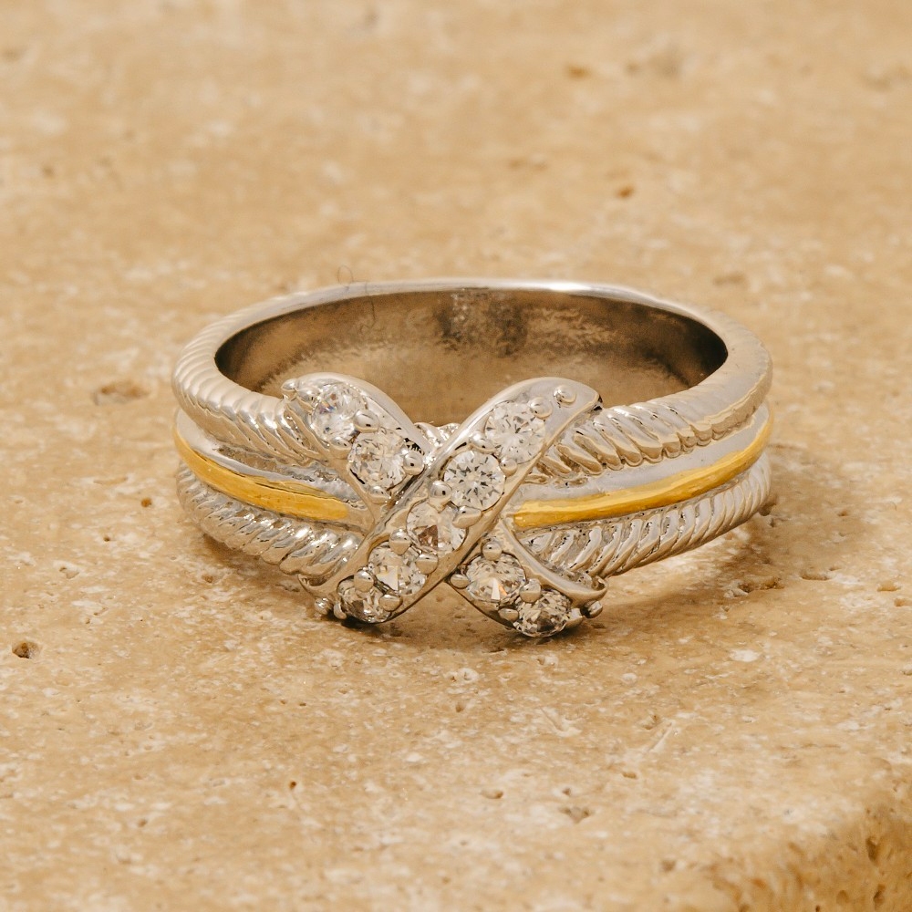 - Add a touch of luxury to any outfit, this ring emanates an elegant two tone cubic zirconia pave x band design. A perfect addition to your wardrobe that effortlessly enhances your style. Available in T7. This item is sold in packs of 1.