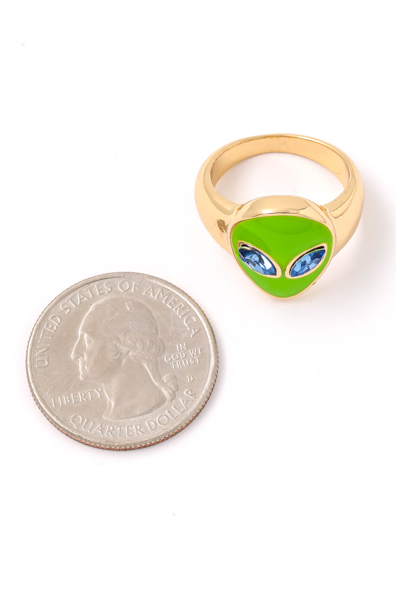 "This new must have trending ring that features a unique alien head signet ring design. Perfect for those who love making a fashion statement. Available in Ggn, Gpk and Gwh. "