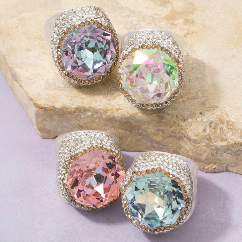 • This season's hottest ring, this ring incorporates a remarkable faceted crystal stone statement design. A must-have ring for anyone who loves to add some flair to their outfits. Available in SLAB, SLBL, SLPK, SLPU. This item is sold in packs of 1.