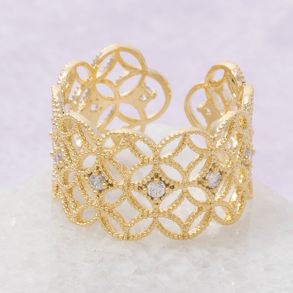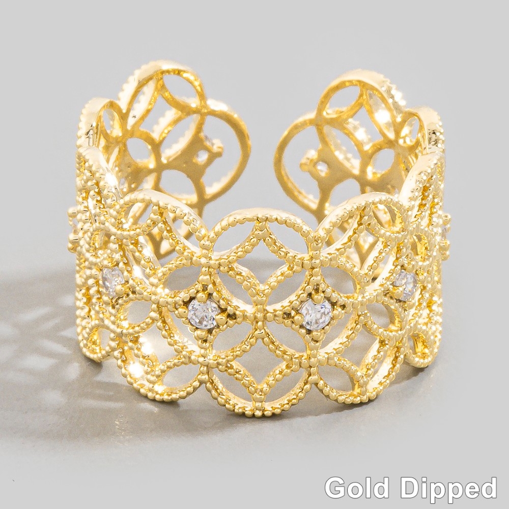 • Make a statement, this ring features an exceptional gold dipped cubic zirconia filigree design. This item is ideal for those who want to add some personality to their wardrobe without being too bold. Available in G. This item is sold in packs of 1.