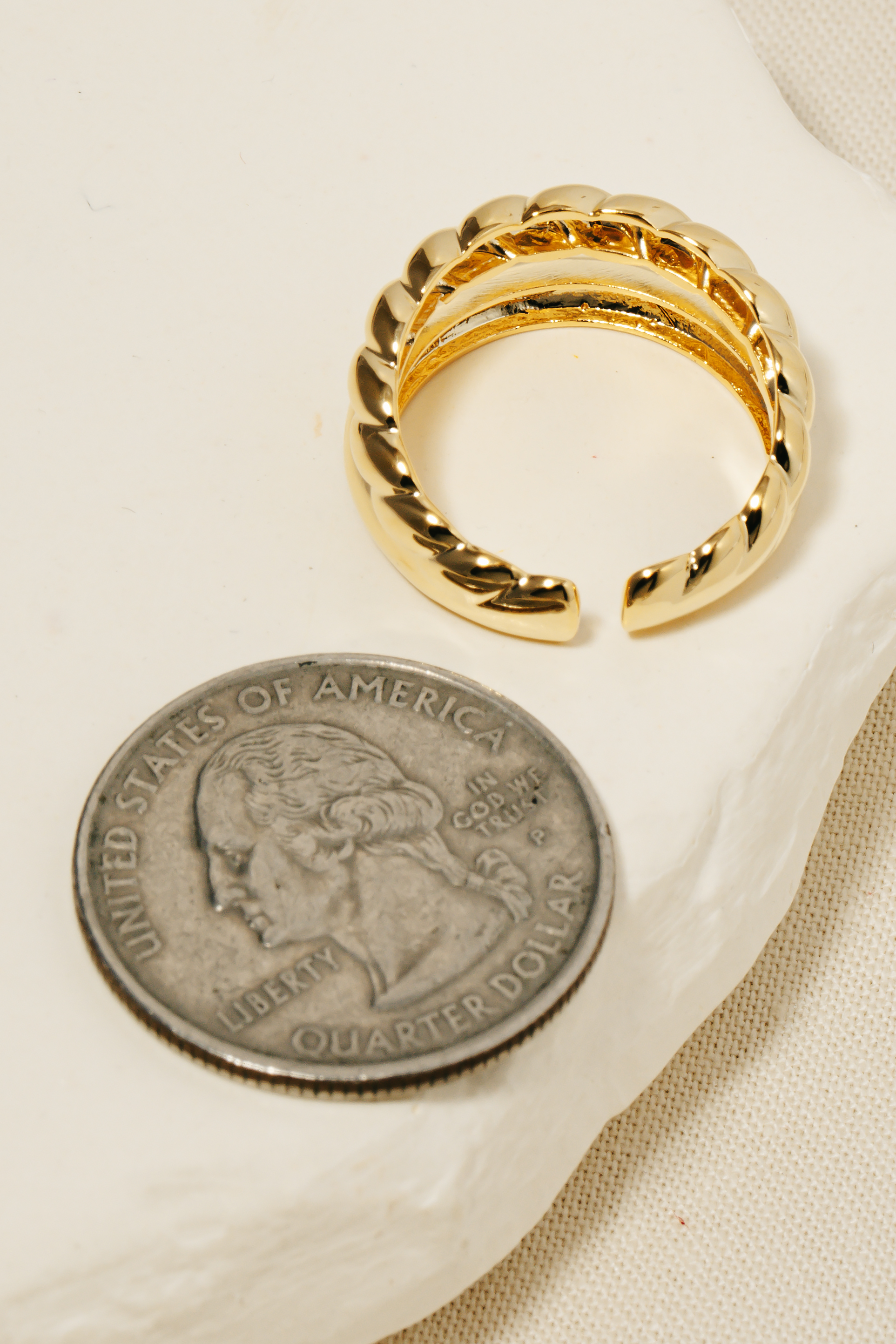 The perfect way to complete any outfit, this ring exudes a refined gold dipped gold dipped croissant layered open band design. Elevate your fashion game with this versatile ring, seamlessly integrating into your signature style. Available in G and S. This item is sold in packs of 1.