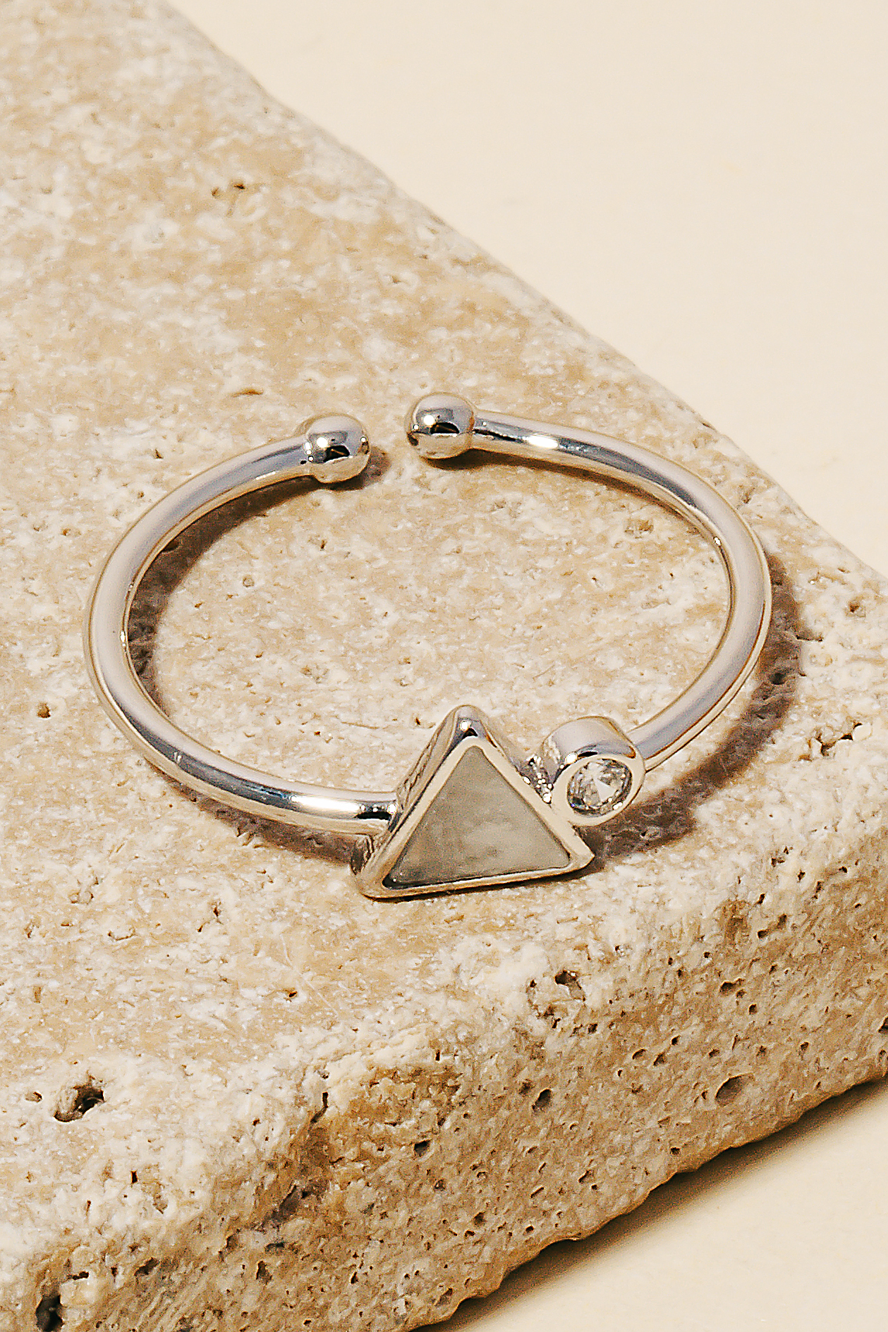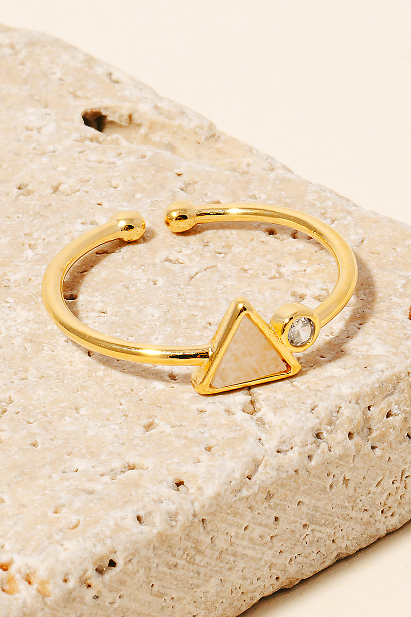• This piece is both timeless and on-trend, this ring radiates a sleek gold dipped gold dipped gemstone triangle and cubic zirconia stud open band design. A perfect addition to your wardrobe that effortlessly enhances your style. Available in G and S. This item is sold in packs of 1.
