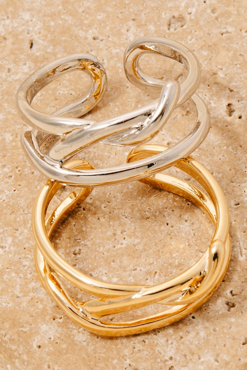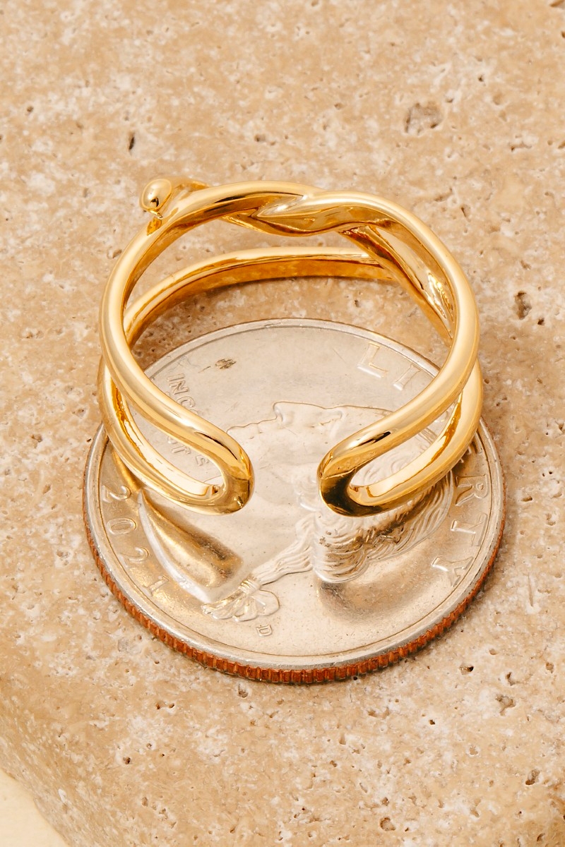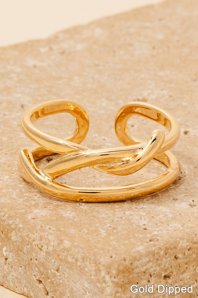 The perfect way to add some sparkle to your outfit, this ring reveals an intricate gold dipped layered twisted open band design. A perfect addition to your wardrobe that effortlessly enhances your style. Available in G, S. This item is sold in packs of 1.