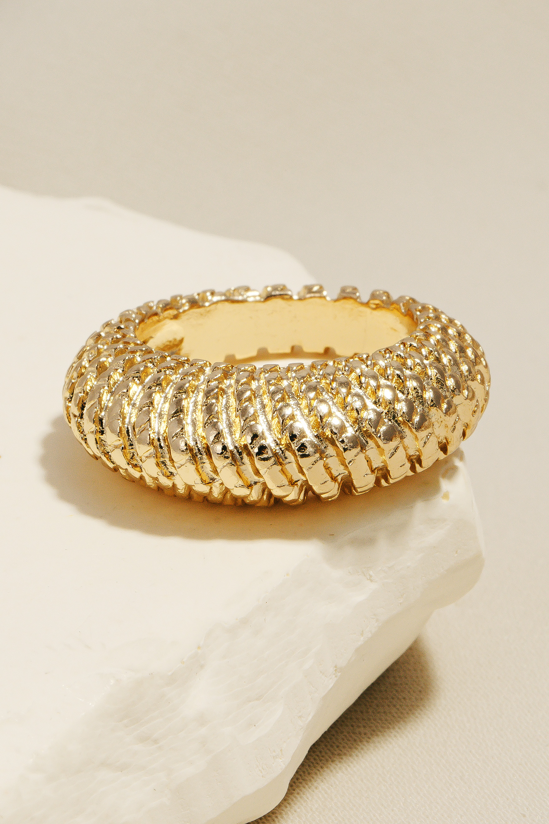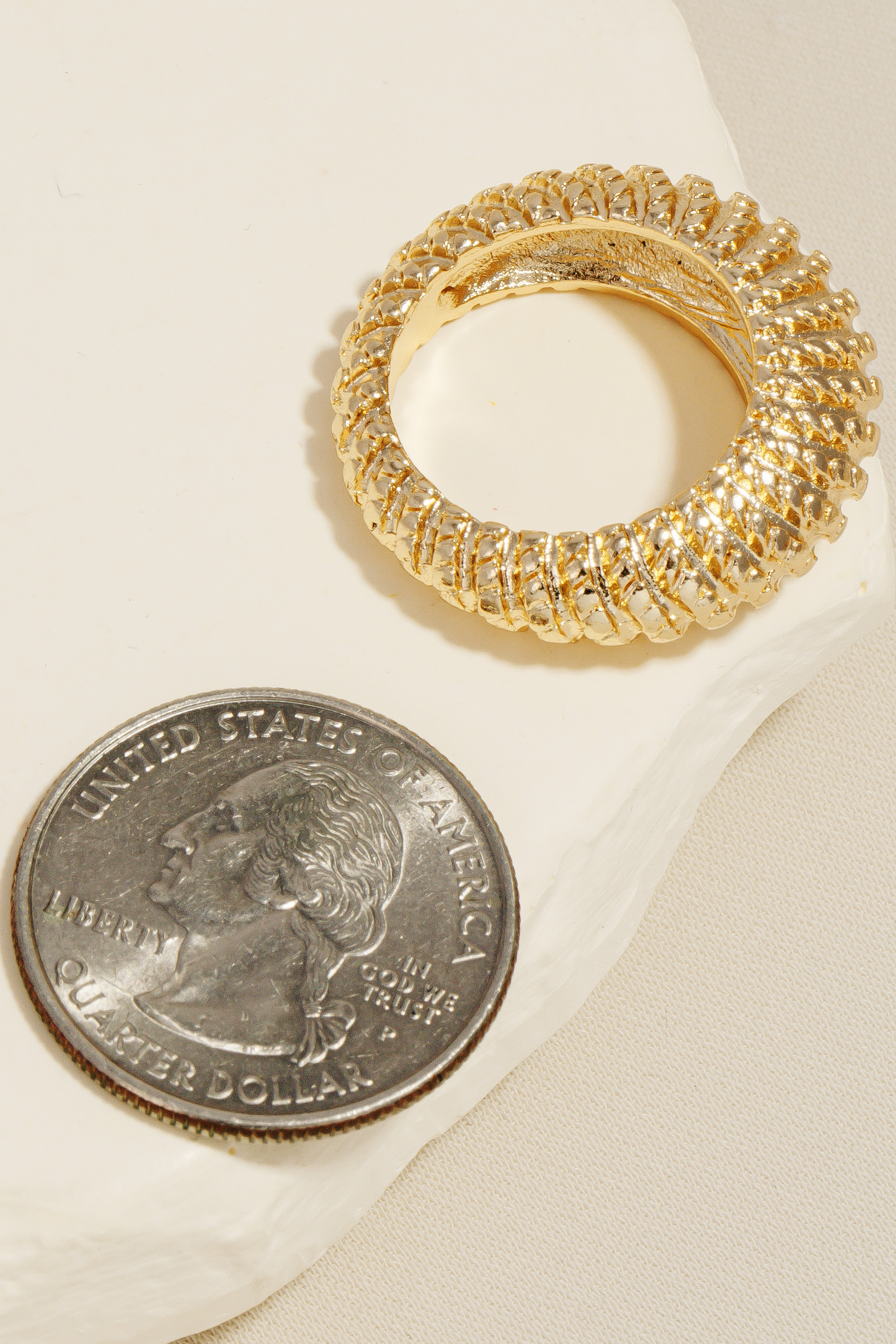 • Bold and daring, this ring encompasses a grand intricate textured metallic band design. This item adds the perfect finishing touch to any outfit, making it stand out from the crowd. Available in GD and RH. This item is sold in packs of 1.