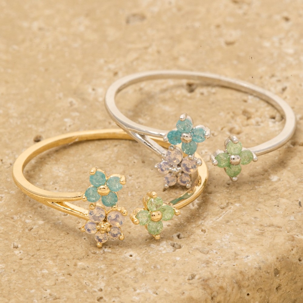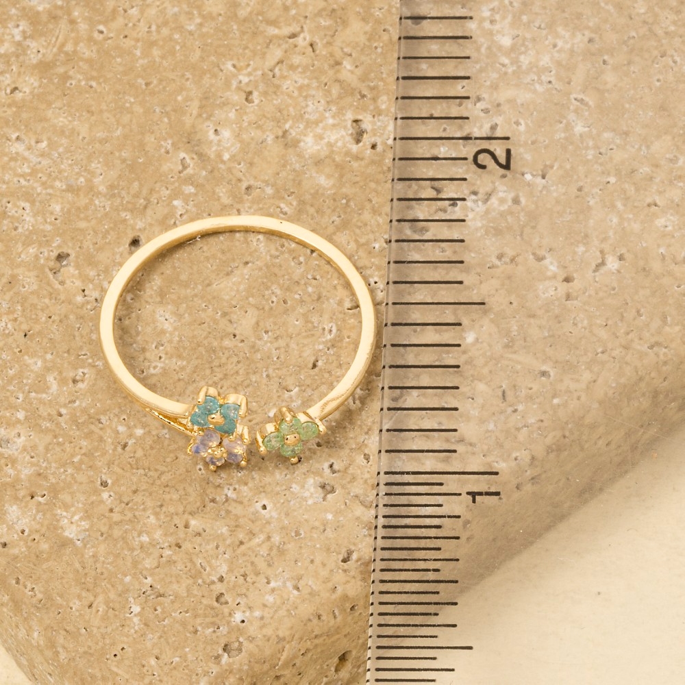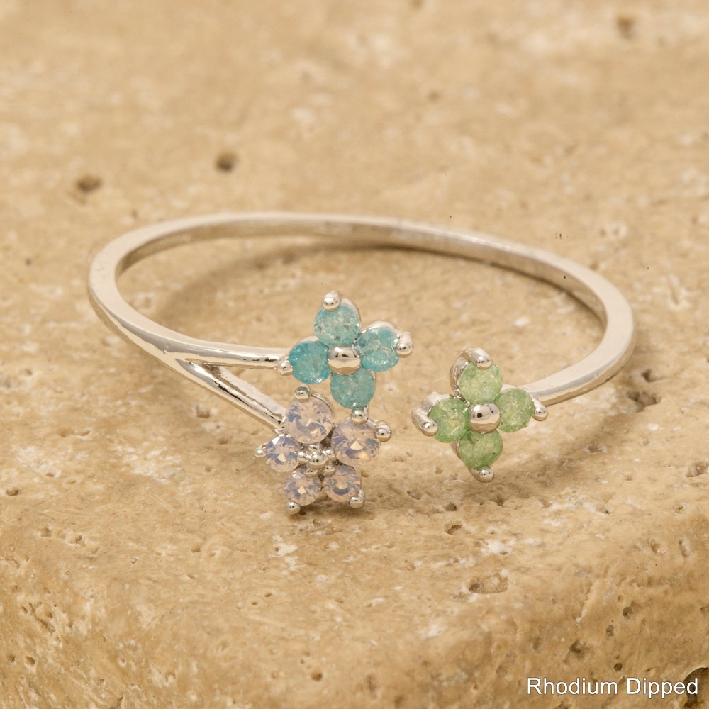• This ring introduces a unique triple mini cubic zirconia flowers open band style. Step into a world of refined taste as this ring effortlessly refines the details of your outfit.