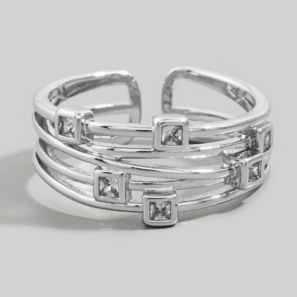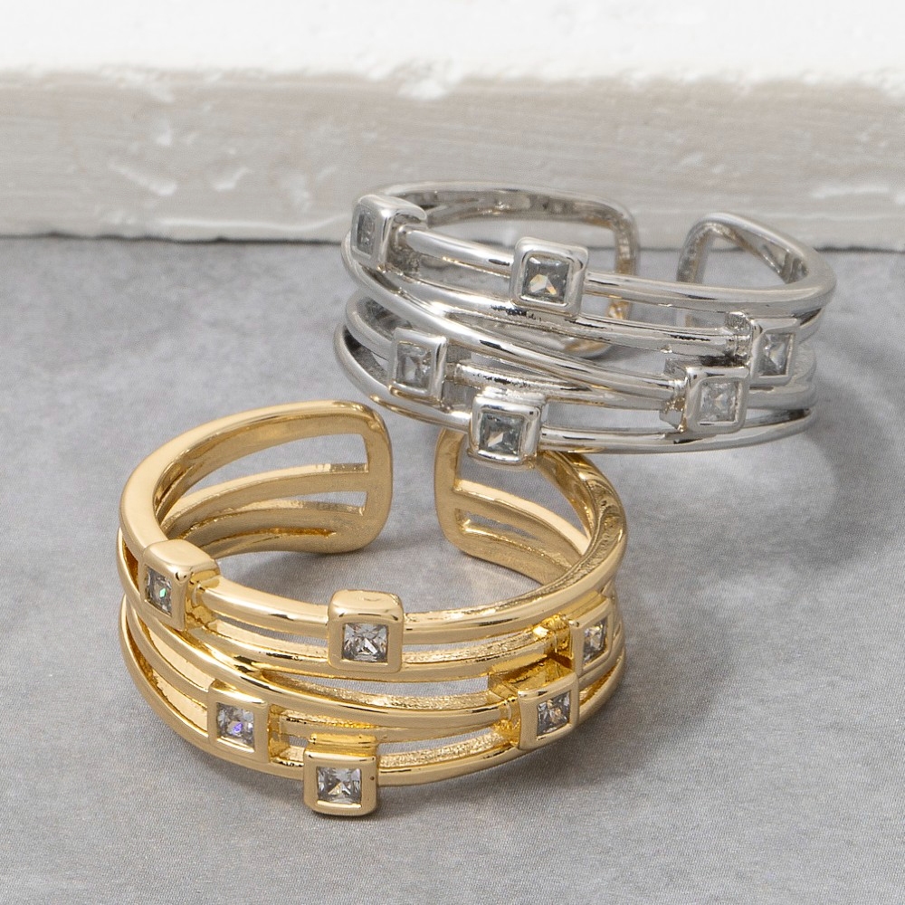 The perfect way to complete any outfit, this ring adds a distinctive multi-band square cubic zirconia station open cuff design. The perfect way to complete any outfit, whether you're dressing up or keeping it casual. Available in G, X. This item is sold in packs of 1.