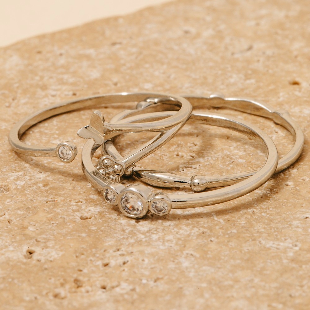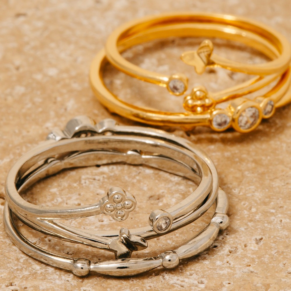 • A timeless piece that will never go out of style, this ring set reveals an intricate 3pc mixed clover and butterflies band rings set design. Elevate your style effortlessly with this versatile ring set, enhancing the appeal of any ensemble. Available in GDCRY, RHCRY. This item is sold in packs of 1.