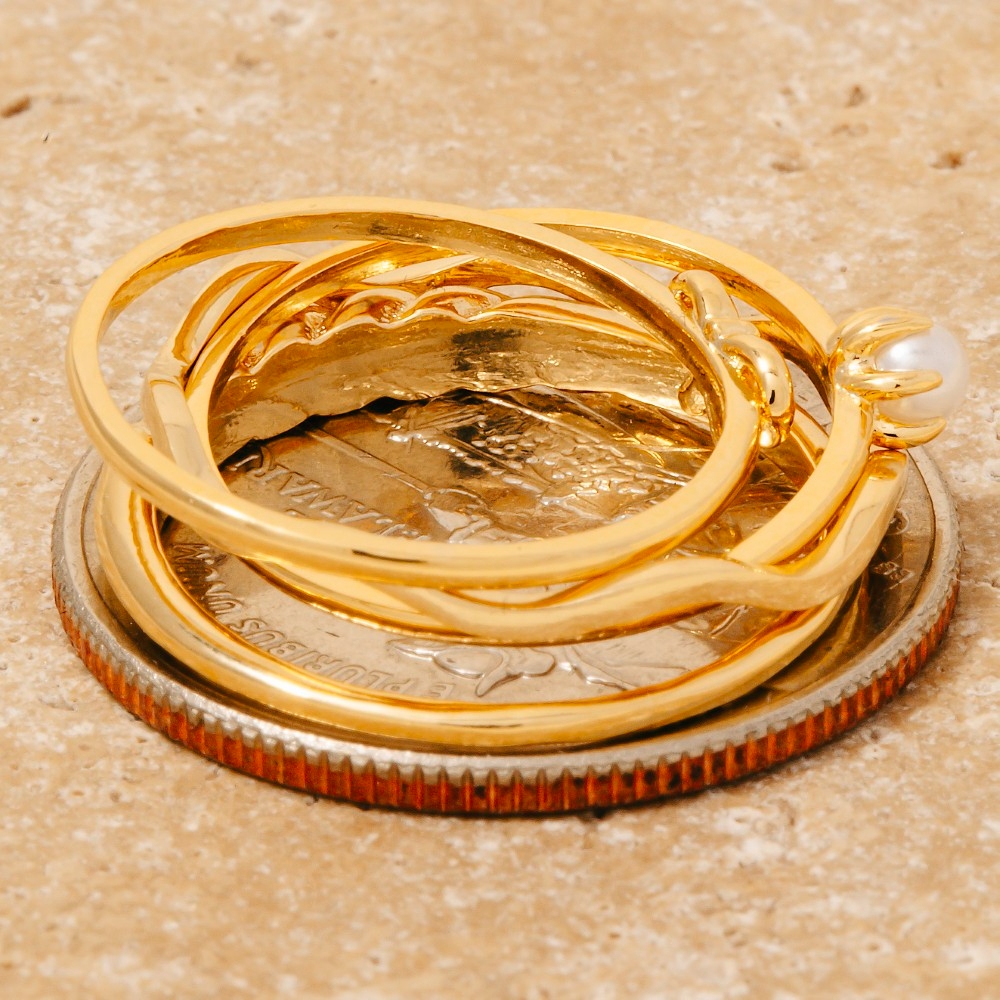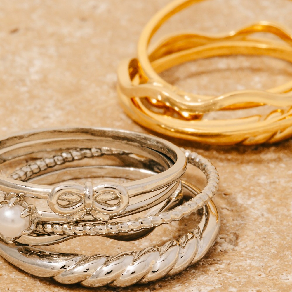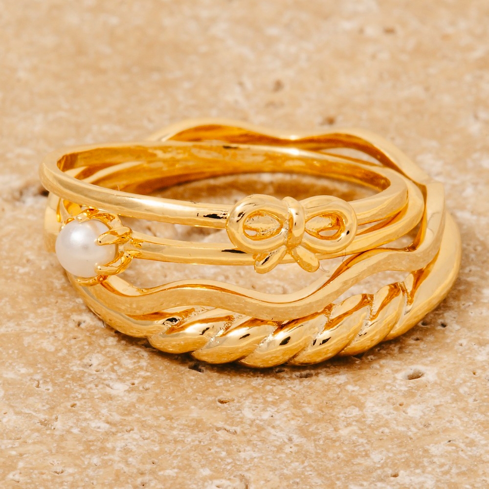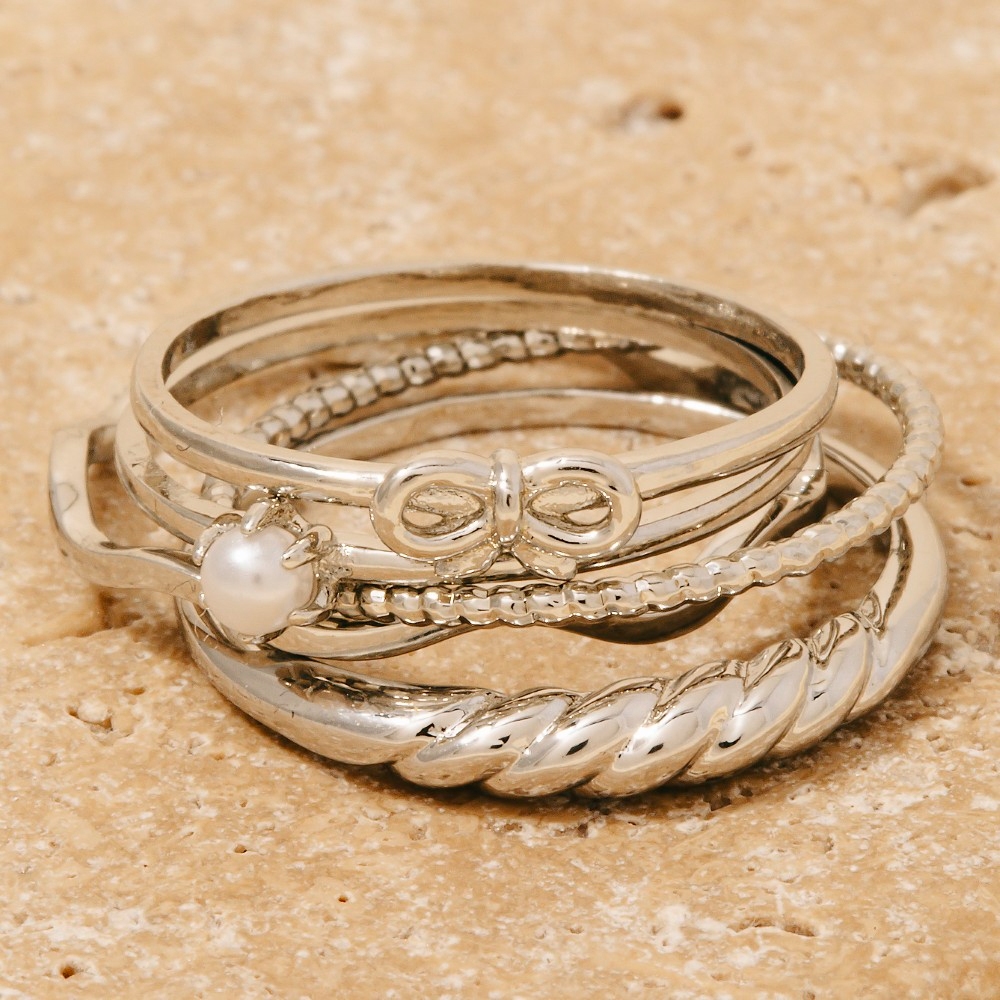 - A contemporary masterpiece, this ring set radiates a sleek 5pc bow and pearl mixed band rings set design. Elevate your personal style effortlessly with this versatile ring set, an essential component for a refined wardrobe. Available in GDCRM, RHCRM. This item is sold in packs of 1.