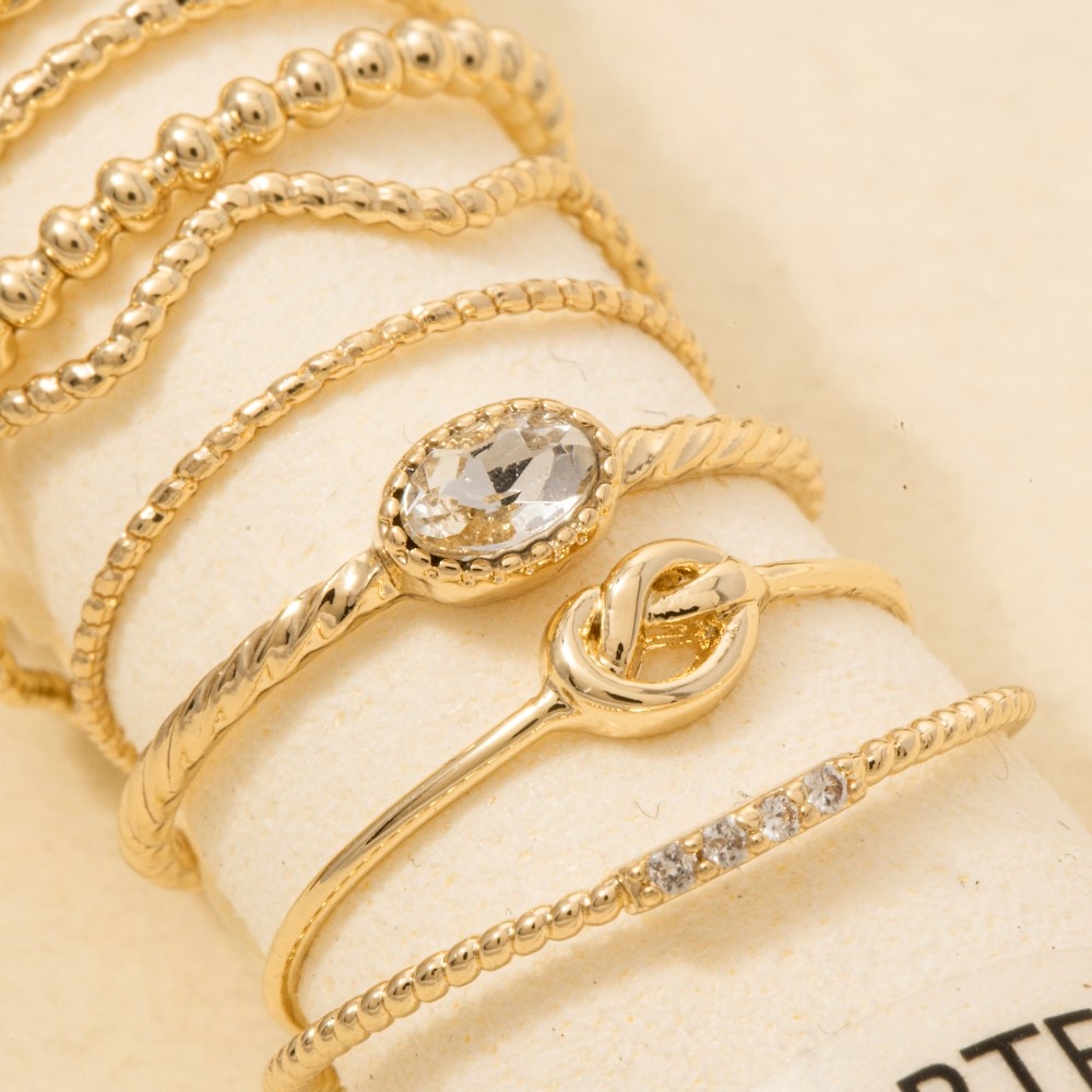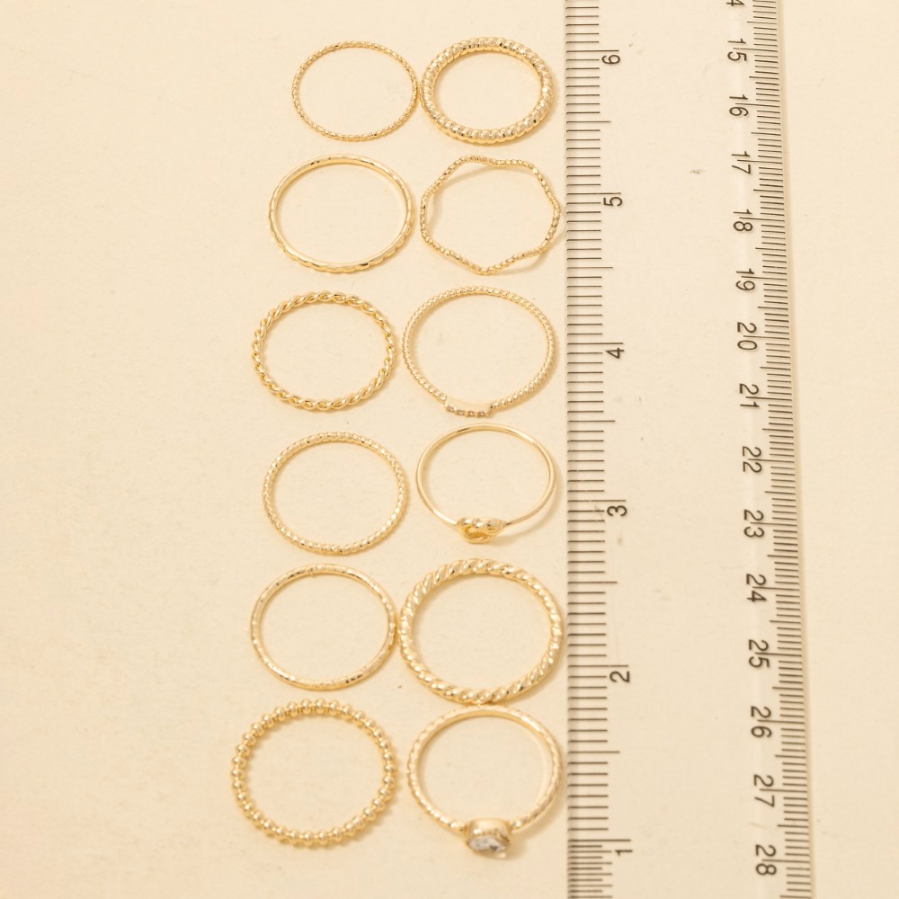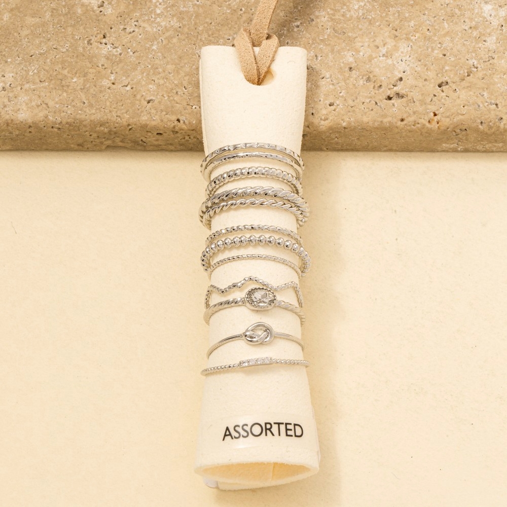 - Effortlessly chic and always on-trend, this ring encompasses a grand assorted ten piece metallic set design. Unleash the potential of your wardrobe with this versatile ring, ensuring a touch of elegance in every ensemble. Available in GDCRY, RHCRY. This item is sold in packs of 1.