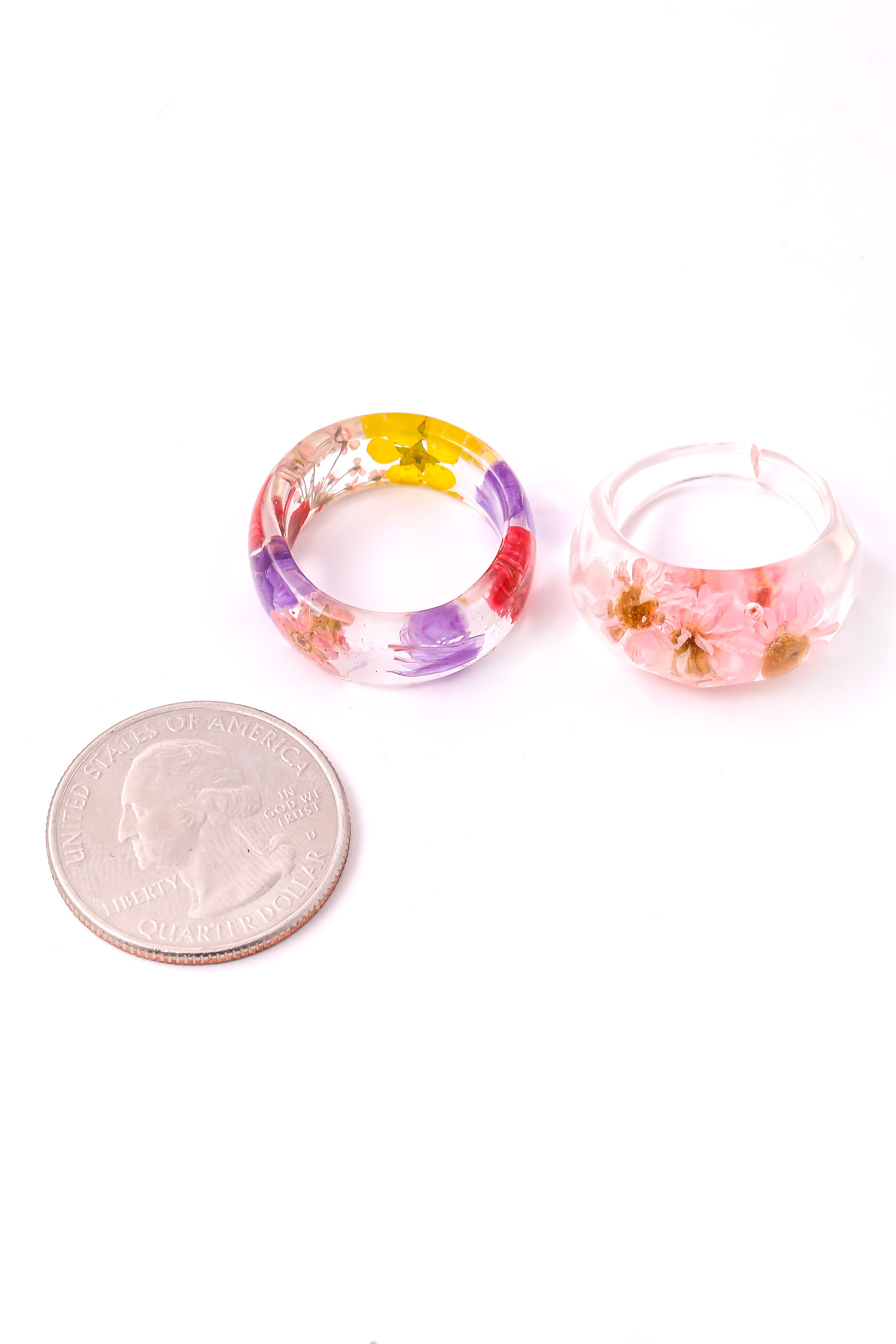 • "A must have ring features a clear thick resin flower ring set design. Perfect for everyday wear. Available in Multi. ***PRE ORDER ITEM AVAILABLE 04/21/21***"